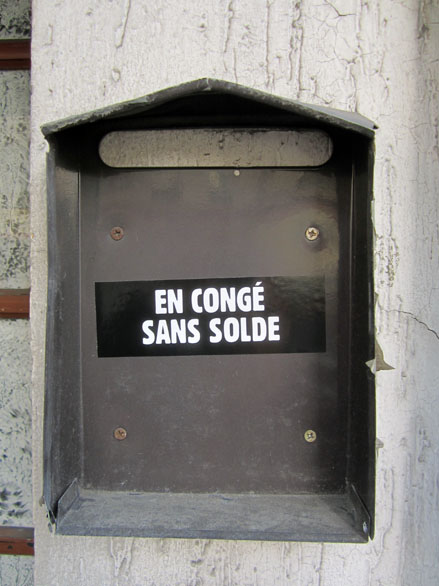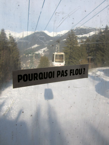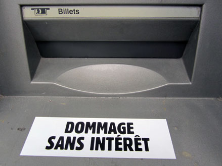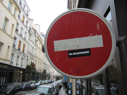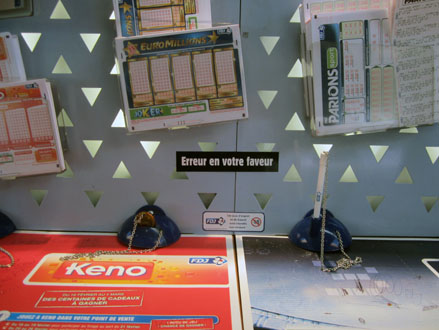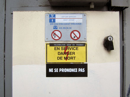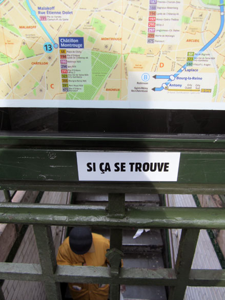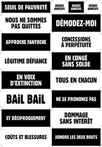 Ces «Adages Adhésifs», comme autant de cadavres exquis typographiques, ne prennent sens qu’in situ, en plein air (de rien), au moindre recoin de la rue, n’importe où mais pas n’importe comment, pour que ça colle vraiment entre brève de style et fragment de réalité. Histoire d’en foutre partout où ça nous plaît, d’inventer de petites légendes à la vie quotidienne, de la sous-titrer pour de faux, de lui trouver des raccourcis scotchants et de délimiter par-ci par-là des zones de polysémie clandestine, des lapsus visuels, bref, très littéralement des lieux-dits.