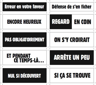 Avec l’ami graphiste & plasticien Philippe Bretelle, on a conçu une vingtaine d’autocollants, de dix centimètres sur quinze, en noir sur blanc… et réciproquement. Avec juste trois quatre cinq mots maximum dessus, un petit bout de phrase sans début ni fin.