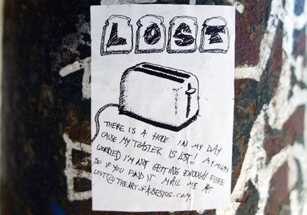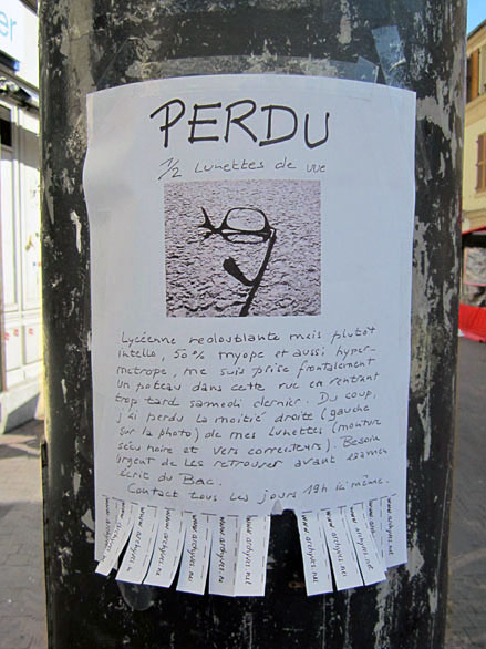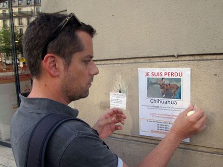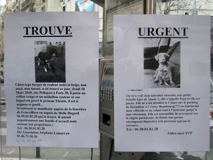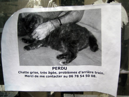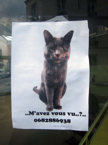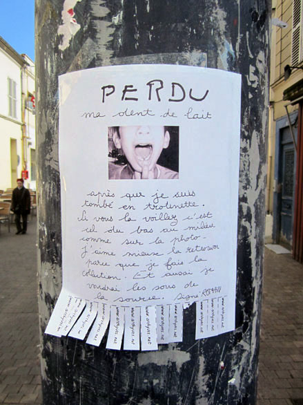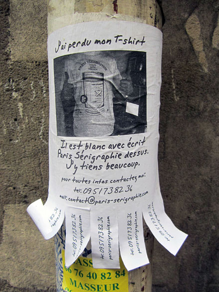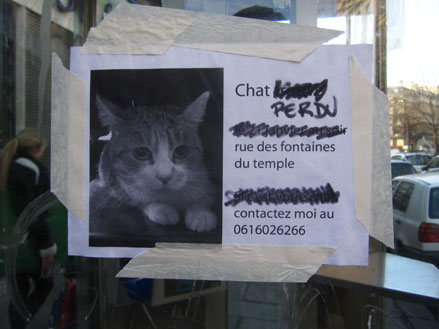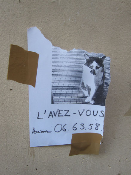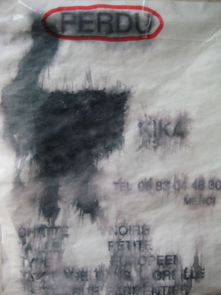 Parmi tous les arts mutins de l’écriture murale – des aphorismes aérosol aux blazes indélébiles, des pochoirs typo sur bitume aux messages perso typex, des silhouettes parlantes sur papier collés aux posters sauvages XXL, du slogan adhésif des stickers aux mosaïques perchées des space invaders –, il en est un qui se contente de peu, pirater l’air de rien les avis de recherche scotchés à la va-vite sur les poteaux qui parsèment les trottoirs. On y tellement habitués à ces affichettes d’un voisin qui a perdu chien ou chat qu’elles font déjà partie du décor. Mais avant d’aller voir du côté parodique, pour se mettre dans le bain, quelques spécimens pour de vrai.
