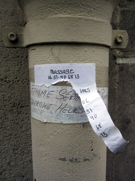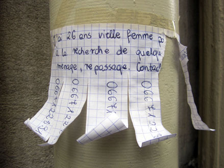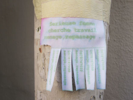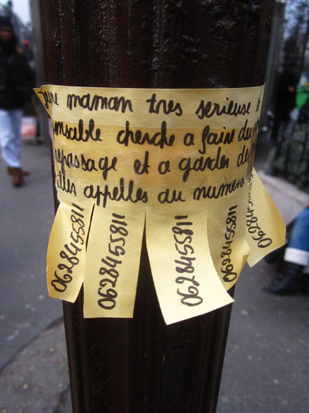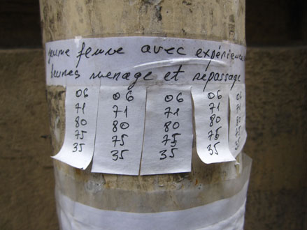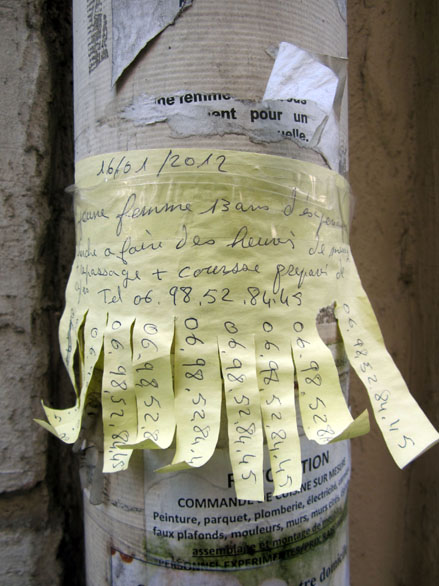 Des avis d’un autre type, en quête d’un emploi à domicile, se trouvent plutôt sur les gouttières d’évacuation. Ces petites annonces-là – qui en disent long sur les conditions précaires de la survie –, souvent manuscrites, et d’une main féminine, comportent une sorte de collerette à franges vers le bas, permettant à chacun d’y détacher un numéro de téléphone, pour mémoire. Là encore, ça va se nicher dans de tels recoins qu’on finirait par oublier l’omniprésence de ces billets, d’une si troublante délicatesse. Depuis un an ou deux, j’en ai photographié toute une série, sans but particulier, juste pour ne pas oublier que ça existe. Quelques spécimens ci-dessous, dont deux intrus qui ont dû me mettre la puce à l’oreille.