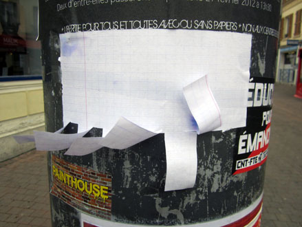 À ce petit jeu, on apprend justement à disparaître autant que possible, à s’effacer dans le geste même de l’exposition, à ne parsemer ici ou là que des motifs imperceptibles d’interrogation. Puisque l’idéal serait que ces flyers fantoches se fondent dans le paysage urbain, selon la stratégie de la lettre volée. Et plus c’est banalement contrefait, proche de l’original, mieux ça passe inaperçu. D’ailleurs, comme je m’y suis essayé récemment, dans mon quartier, j’ai pu voir sur le visage des passants à l’arrêt, en train de déchiffrer la chose, quelques moues dubitatives et pas mal de sourires en coin.