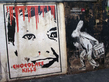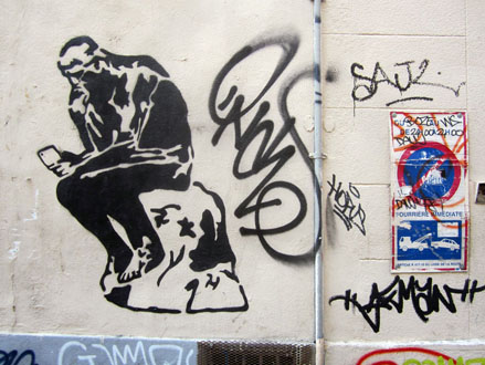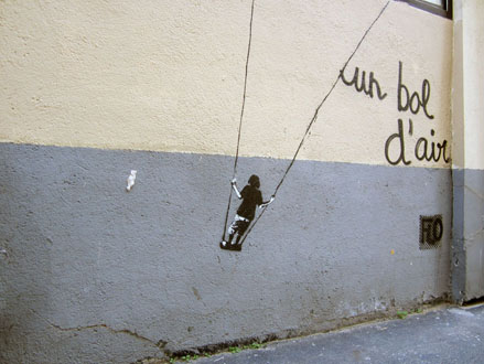 Dès la fin des années 70 – bombes aérosols aidant –, la vieille technique du pochoir a connu un renouveau underground, dont les pionniers parisiens se nommaient Blek-le-rat (le dandy rebel) et MissTic (avant de louer son sens de la formules aux publicitaires), dans la lignée de la provoc picturale du groupe Bazooka décalquant photos et polaroïds à grands traits géométriques. Cet art de l’impression négative n’a cessé de faire des émules, de l’agit-prop textuelle aux rébus minimalistes en passant par toutes sortes d’imageries ombreuses.