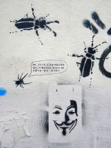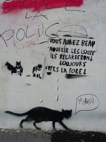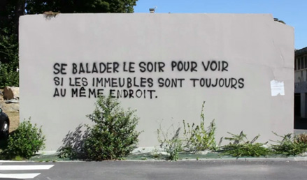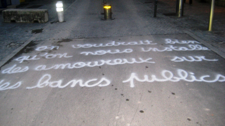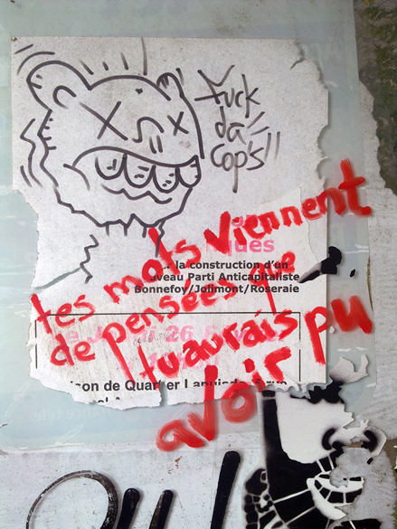 Alors, pour refaire émerger la permanence anonyme & clandestine de la poésie subversive depuis quatre décennies, on a fureté un peu partout, depuis les bombages des années 69-71 à Londres par les enragés british de King Mob, jusqu’au renouveau du pochoir révolutionnaire place Tarhir, en passant par les petits mots doux & rageurs qui font partout des petits : à Dijon ou Melbourne, Niort ou New York, Saint-Étienne ou Berlin. Et même à Paris malgré l’efficacité implacable des nettoyeurs municipaux.