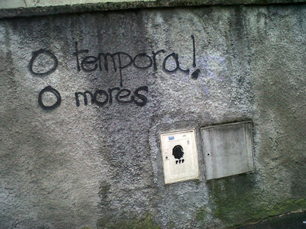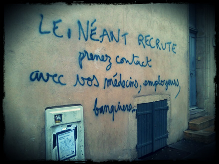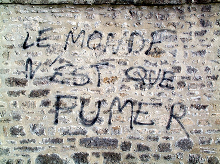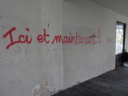 D’où cette compilation numérique, comme un chantier à ciel ouvert, qui voudrait recenser ces bribes d’écritures maladroites, lacunaires, éphémères, glanés depuis trois années dans des livres, revues, sites web ou, pour les plus contemporaines, avec mon appareil photo toujours aux aguets… Ici, nul souci d’exhaustivité, puisque la tâche est infinie par définition même. Mais, tout de même, déjà plus de 2300 graffiti distincts – pris en note, datés et localisés – dans ce recueil perpétuellement provisoire, à feuilleter ou télécharger en format pdf ici même….