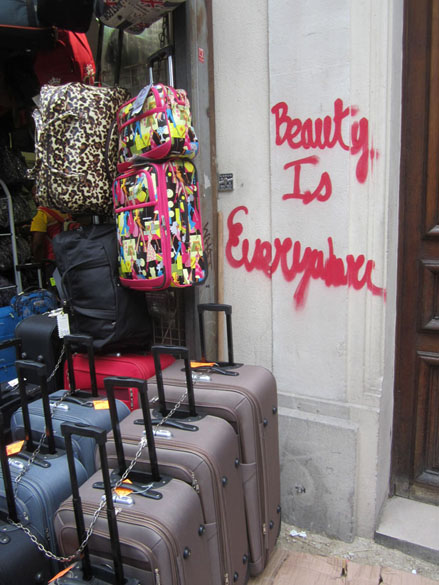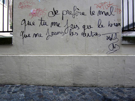 Alors, pour refaire émerger la permanence anonyme & clandestine de la poésie subversive depuis quatre décennies, on a fureté un peu partout, depuis les bombages des années 70 jusqu’au renouveau du pochoir contemporain. D’où cette compilation numérique, comme un chantier à ciel ouvert, qui voudrait recenser ces écritures à l’air libre de nos quarante dernières années, retrouvées dans des livres, revues, sites web ou, pour les plus contemporaines, avec mon appareil photo toujours aux aguets…