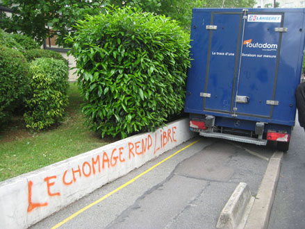 Menacé de licenciement, puis lavé de tout soupçon, il incarne à la fois un working-poor parmi tant d’autres susceptible de se pointer au Resto du Cœur pour boucler ses fins de mois, et la figure plus clandestine du « glaneur » de fin de marché que les grandes surfaces justement cherchent à éloigner de leur réserve d’invendus, en mettant sous clef les bennes à ordures et contrôlant chaque déstockage de ces denrées encore comestibles mais sacrifiées d’office. Faire consommer à flux tendus, et puis consumer les restes, c’est la logique mortifère de Carrefour et de son sponsoring philantropique. Et face à ce gâchis structurel, on entrevoit une autre réaction possible : récupérer ses droits, plutôt que se faire récupérer par on ne sait quel logo humanitaire. Mais pour interagir, se solidariser en acte, il faut aussi avoir décloisonné dans sa tête certains stéréotypes, et les oppositions trompeuses entre la marginal débrouillard et l’honnête salarié. Et de ce point de vue, la meilleure façon de prendre le double discours de Carrefour au pied de la lettre, c’est sans doute d’aller y glaner à plusieurs, au pays merveilleux de l’hyperabondance, et tant qu’à faire, direct dans les rayons plutôt qu’à la poubelle, pour reprendre ses droits collectifs à la source, «autoréduction», ça s’appelle. Et depuis quelques années, quelques collectifs de chômeurs & de précaires ont commencé à prendre la bouffe sur le tas et à sortir par la grande porte, comme ici ou là. Même si la police est souvent là pour veiller au tri des futurs déchets, soit tout bêtement humains, soit provisoirement valorisables dans la limite des dates de fraîcheur.