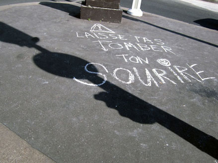 Petite dînette au motif vichy, en guise de post-scriptum. Délicate ironie de son mauvais sort. Mais ce n’est pas tout, sur le trottoir, un autre mot d’adieu colorié à la craie. Encore indéchiffrable à l’envers.