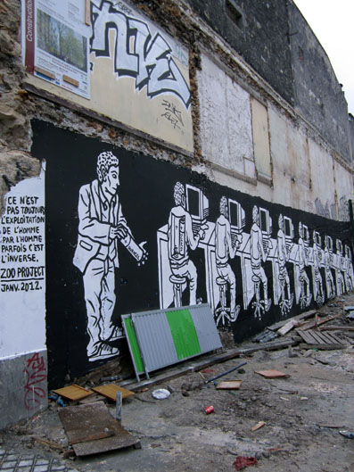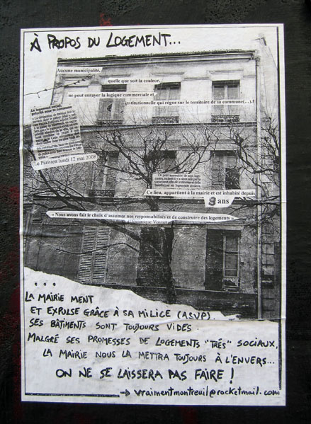 Pour quitter ces sphères idéologiques des sciences humaines et revenir à un cas d’espèce bien réel, prenons une commune du nord-est de Paris, Montreuil en l’occurrence, où les graffiti, dépôts d’ordure sur le trottoir, marchés sauvages de biffins, campements illégaux de Rroms, maisons squattées et tant d’autres incivilités abondent, donnant ainsi le pire exemple. On pourrait objecter qu’à la racine ça vient surtout des spéculateurs privés et des sociétés immoblières qui préfèrent ne jamais rien réhabiliter ni ravaler les façades ni louer à bas prix ces locaux vacants, et qui profitent d’une sorte de jachère spéculative, en attendant que la «pierre travaille toute seule», hors sol, selon l’inflation abstraite des lois du marché, pour revendre ces «dents creuses» et terrains vagues sans risque de loyers impayés, laissant dans des taudis ou à la rue, des milliers d’habitants peu argentés ou n’ayant que des revenus précaires. On aurait envie d’affirmer que c’est bien là l’incivilité première, la «mère de tous les vices» pour reprendre l’expression du préjugé moral qui sous-tend la «Broken Window Theory» – et même le «boss des vices» pour causer français moderne. Il arrive aussi à Domonique Voynet, la Maire du coin, d’entonner ce discours dans la presse ou à la radio, vitupérant les charognards spéculatifs qui obligent près de 6000 candidats aux HLM à rester sur des listes d’attente. C’est pas moi, c’est elle qui fait le lien. Et pourtant, au-delà de telles déclarations de principe, il y a un envers du décor. Au quotidien, la municipalité a de pires ennemis que les méchants vautours de l’immobilier, ce sont les «squatteurs», surtout s’ils manifestent collectivement leur façon de lutter en acte contre le cynisme des marchands de biens et autres propriétaires de locaux voués à se renchérir à vide. D’ailleurs ce ne sont pas de vrais mal logés qui repeuplent ces squats – en l’occurrence de jeunes précaires, intermittents de l’emploi (déclaré ou non), chômeurs partiels, qui cohabitent dans leur maisons occupés avec des familles de sans pap’, des déboutés du droit d’asile, des Rroms… –, non, aux yeux de Dominique Voynet, ce sont des «politiques», entendez des anarchistes qui feraient mieux «d’aller emménager à Neuilly».