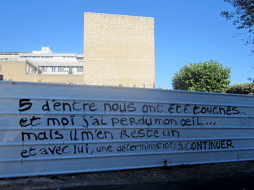 Ce qui nous relie, c’est l’arme avec laquelle nous avons été frappés : un flashball. Comment qualifier cette arme, maintenant très répandue dans la police, qu’elle use comme on use d’une matraque ? Une arme qui terrorise. Une arme avec laquelle la police a de nouveau le droit de tirer sur la population. Une arme avec laquelle elle tire à toute occasion : 2787 tirs de flashball pour l’année 2011. Une arme qui dit : « Rentrez chez vous et n’en sortez plus ».