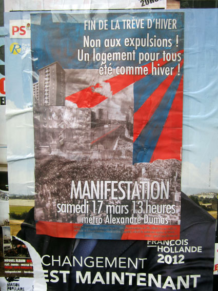 Alors pour toutes ces raisons et d’autres énumérées ci-dessous, on pourra manifester notre désir d’avoir des endroits pour habiter le monde, samedi 17 mars 2012, à 13 heures aux métro Alexandre Dumas.