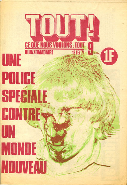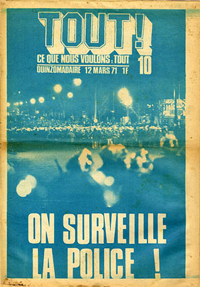 A Montreuil, on a aussi vu fleurir des affiches appelant à «désarmer la police». Programme minimum qui nous renvoie 40 ans en arrière, début mars 1971, quand le quinzomadaire TOUT proposait déjà de leur renvoyer la balle, aux flics, sous ce mot d’ordre désarmant de simplicité : «Surveillons la police!»