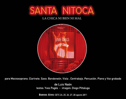 En 2002 Luis Naón m’a demandé d’écrire le livret d’un oratorio pour un petit ensemble instrumental et la soliste mezzo-soprano Sylvia Marini (qui, hasard délicieux, n’est autre que la fille de Giovanna Marini, ethno-musicologue, chef de chœur et interprète de l’inoubliable Lamento per la morte di Pasolini). Je me suis exécuté en vers libre, en imaginant le monologue d’une effeuilleuse de Peep Show. Sainte-Nitouche, la fille ni bien ni mal, ça s’intitule. En contre-point la comédienne Agnès Sourdillon s’est chargée des didascalies sur bande-enregistrée et moi-même des petites annonces en voix-off.