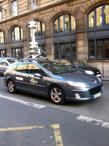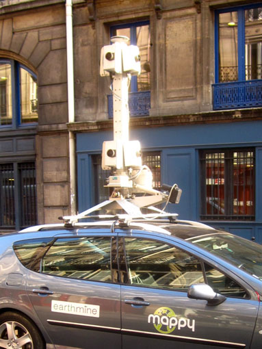 Depuis Bastille, déjà trois feux verts synchro rue Saint-Antoine, avant que ça change de nom, plein gaz rue de Rivoli… Juste après le Bazar de l’Hôtel de Ville, trente secondes d’arrêt au rouge… Ensuite, une fois dépassée l’ancienne place de Grève, clignotant sur la gauche : rue de la coutellerie. Et là, comme ça bouche un peu, j’aperçois un drôle de paratonnerre sur le toit d’une bagnole gris métallisé. En me rapprochant du véhicule suspect, je compte huit caméras réparties en deux niveaux sur l’antenne télescopique. Et le long de la portière arrière, ce logo en guise d’explication : Mappy. Ça vaut le coup d’œil, non ? Je pile à hauteur de l’auto-espion, sors mon petit appareil numérique et cadre en plein dans le mille.