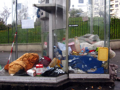 Depuis quelques mois, place Martin Nadaud, à deux pas du Père-Lachaise, quelqu’un avait élu domicile dans une cabine téléphonique. Un studio d’à peine 1 mètre carré, sans la douche mais avec caniveau sur le palier. Juste un petit jardin d’hiver pour ne pas finir légume au cimetière d’à-côté ou, mieux encore, un cagibi futuriste avec baie vitrée sur les quatre côtés pour essayer de conjurer la mort lente. En tout transparence, cet usager-là croyait avoir trouvé protection auprès du service public, un précaire refuge à son infortune. De façon illicite, certes… mais quel mal y aurait-il à ce qu’un gueux profite un peu du bien commun ?