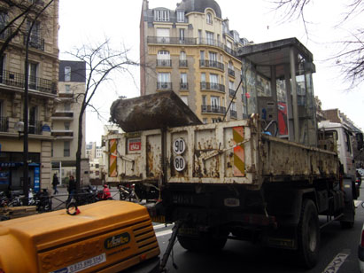 Alors, vendredi dernier, en fin de matinée, on a choisi en haut lieu de faire cesser ce scandale, de déloger l’intrus, de l’expulser de ce drôle de squat miniature : une boîte vocale en grand dérangement. Et tant qu’à faire, aux grands maux, les grands moyens : un camion 12 tonnes. Non pour mettre en demeure l’occupant de quitter les lieux, mais pour transporter sa demeure ailleurs. Et virer tout le vrac d’affaires qui s’entassait à ciel ouvert, direct à la benne. Il a fallu desceller le cube de verre, le tracter sur le hayon arrière du véhicule de chantier… et basta!